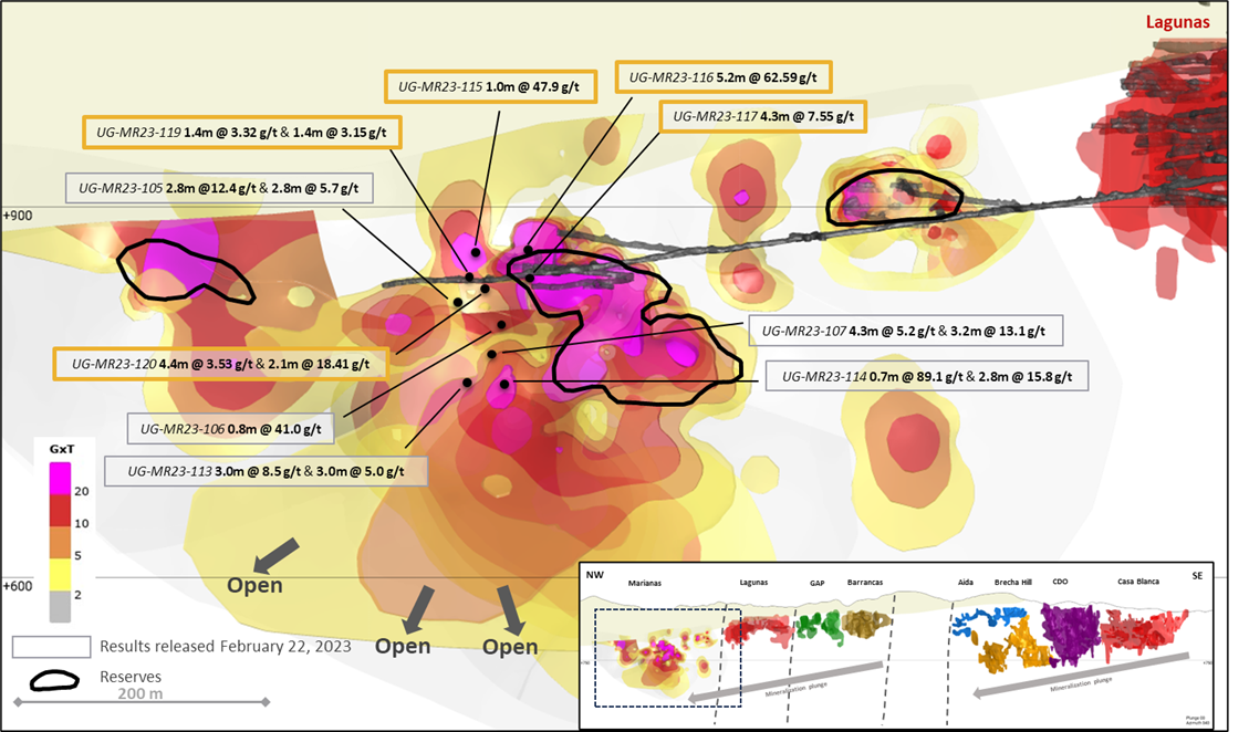 Andrew Swarthout, Director and Qualified Person, states, “Our 2023 drilling program at Mercedes has to date concentrated on improving operations and production in the current workings. We are very excited by the results of this underground drilling program, which have returned intercepts with gold grades substantially higher – in some cases up to 30 times higher – than the currently defined resources of the deposits in which they occur. We are also seeing geological evidence including hydrothermal textures and higher gold and silver grades as we proceed to the north along the main Mercedes structure, which supports our belief that the source of mineralization in the Mercedes district may occur in the unexplored northern extensions of this important structure. This exploration thesis applies to other targets at Mercedes, including the San Martin offset, Klondike, Rey del Oro and Margaritas East and we look forward to reinitiating surface exploration drilling in 2023/24.”